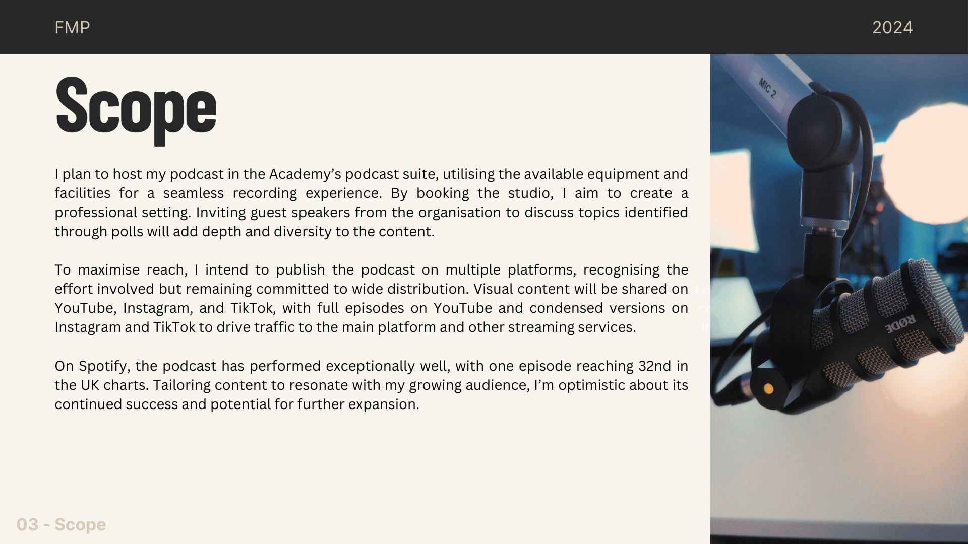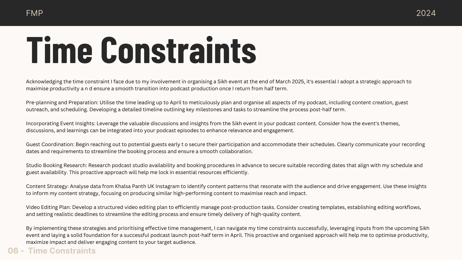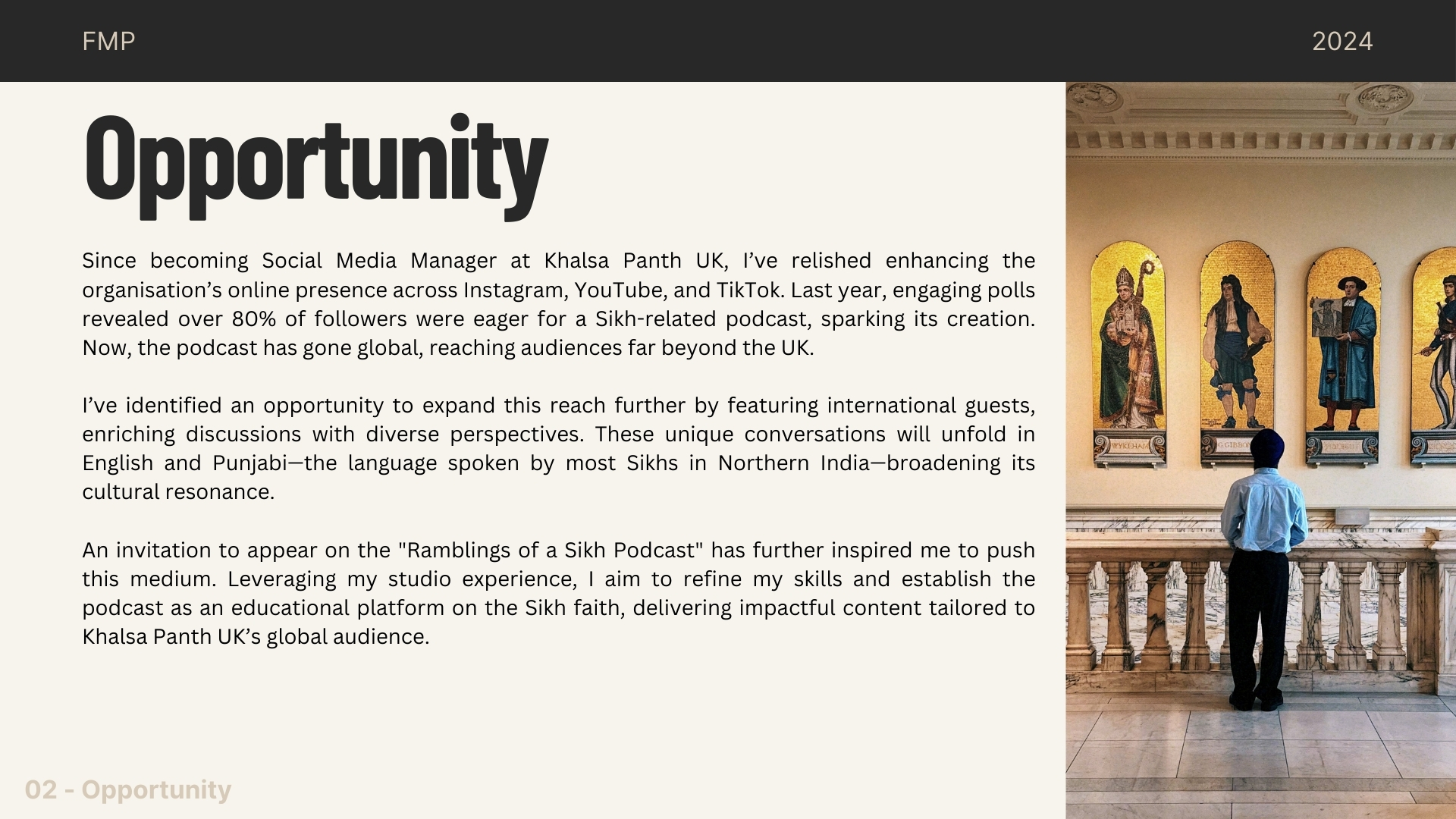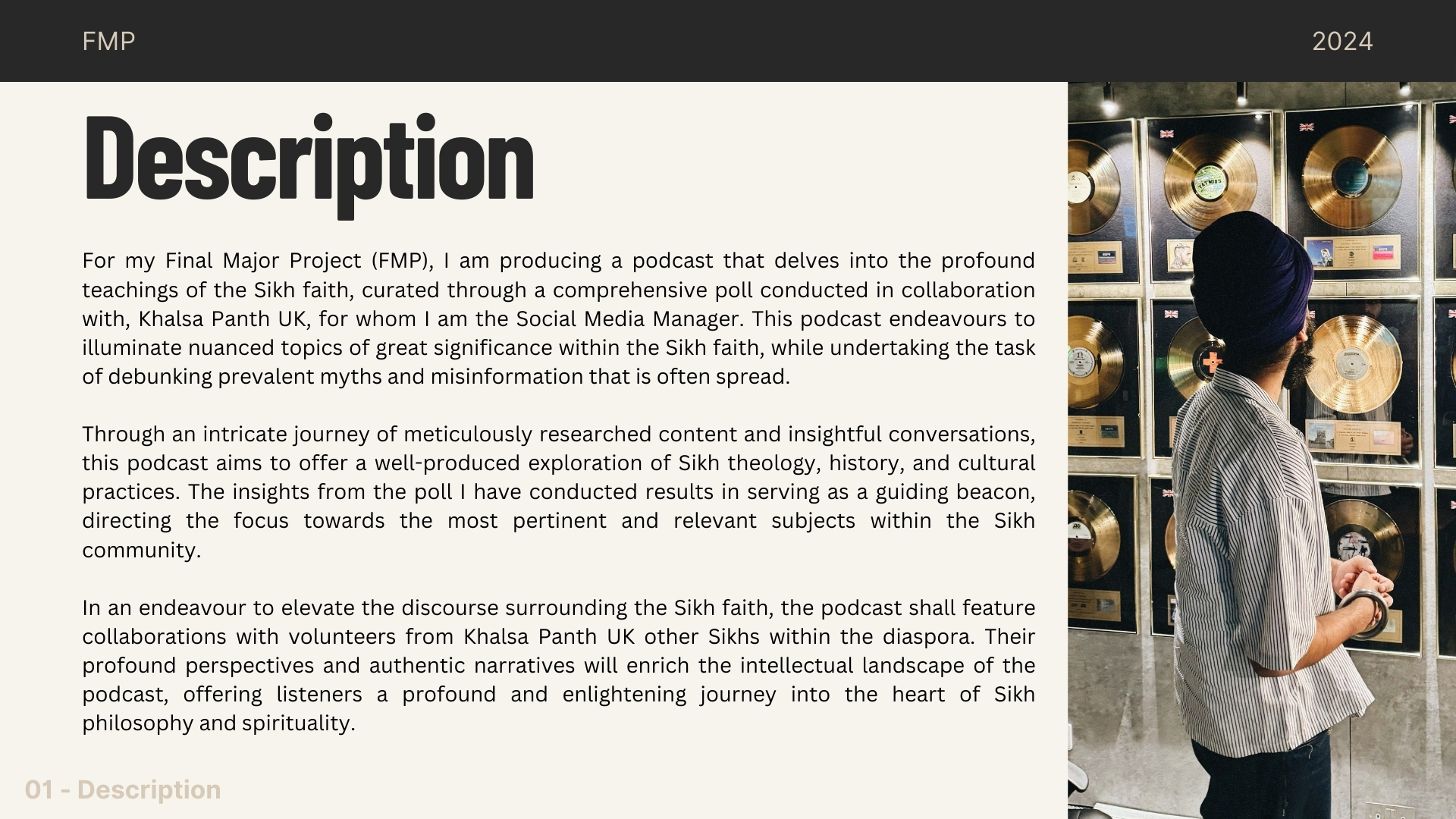 Reflecting on my progress with the Khalsa Panth UK podcast, I’ve grown it from a local effort into a global platform, a key achievement. My Warner Records experience honed my marketing skills, vital for expansion. Last year’s project built my research and podcasting expertise, revealing challenges in marketing and guest diversity. These insights shape my choice to globalise the podcast, targeting North America, Europe, and India with Punjabi episodes. My technical and promotional skills will drive this ambition, creating a culturally resonant, internationally recognised platform that connects the Sikh diaspora through refined content and strategic outreach.