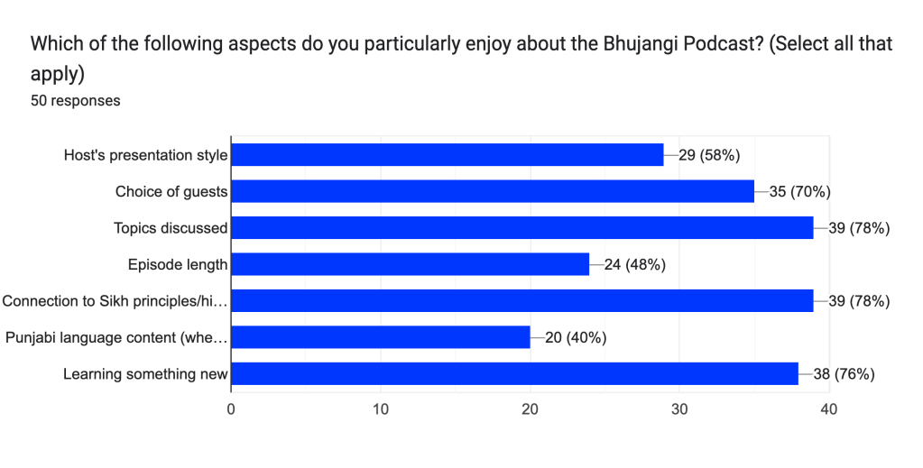 The majority of respondents provided positive feedback, using descriptors such as “educational,” “informative,” “inspiring,” and “chardikala” (high spirits) to describe the podcast. A large number of respondents highlighted the podcast’s authenticity and its willingness to address topics that are typically underrepresented in mainstream Sikh discourse.