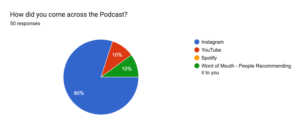 My podcast marketing strategy proved to be effective, with my Instagram engagement exceeding 232,000 during the podcast release. Thec success can be attributed to my approach of using Instagram- where my target audience was already active, to market the podcast. The Google feedback form data confirmed this strategy’s effectiveness, as the majority of listeners discovered the podcast through Instagram.