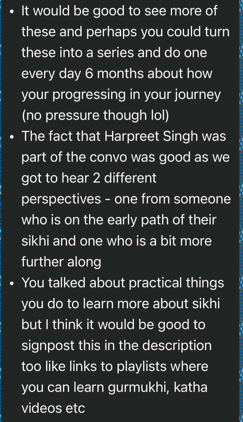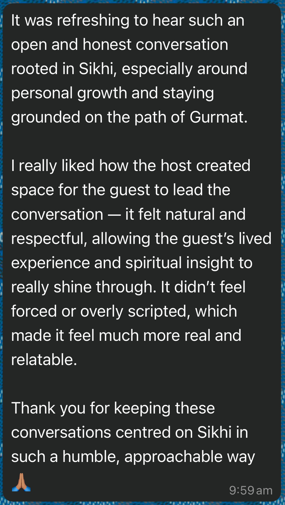 The feedback commends the open and honest conversation rooted in Sikhi, particularly focusing on personal growth and following the path of Gurmat. The listeners appreciate how I created a respectful space that allowed the guest to lead the conversation naturally, enabling their lived experience and spiritual insights to shine through authentically.