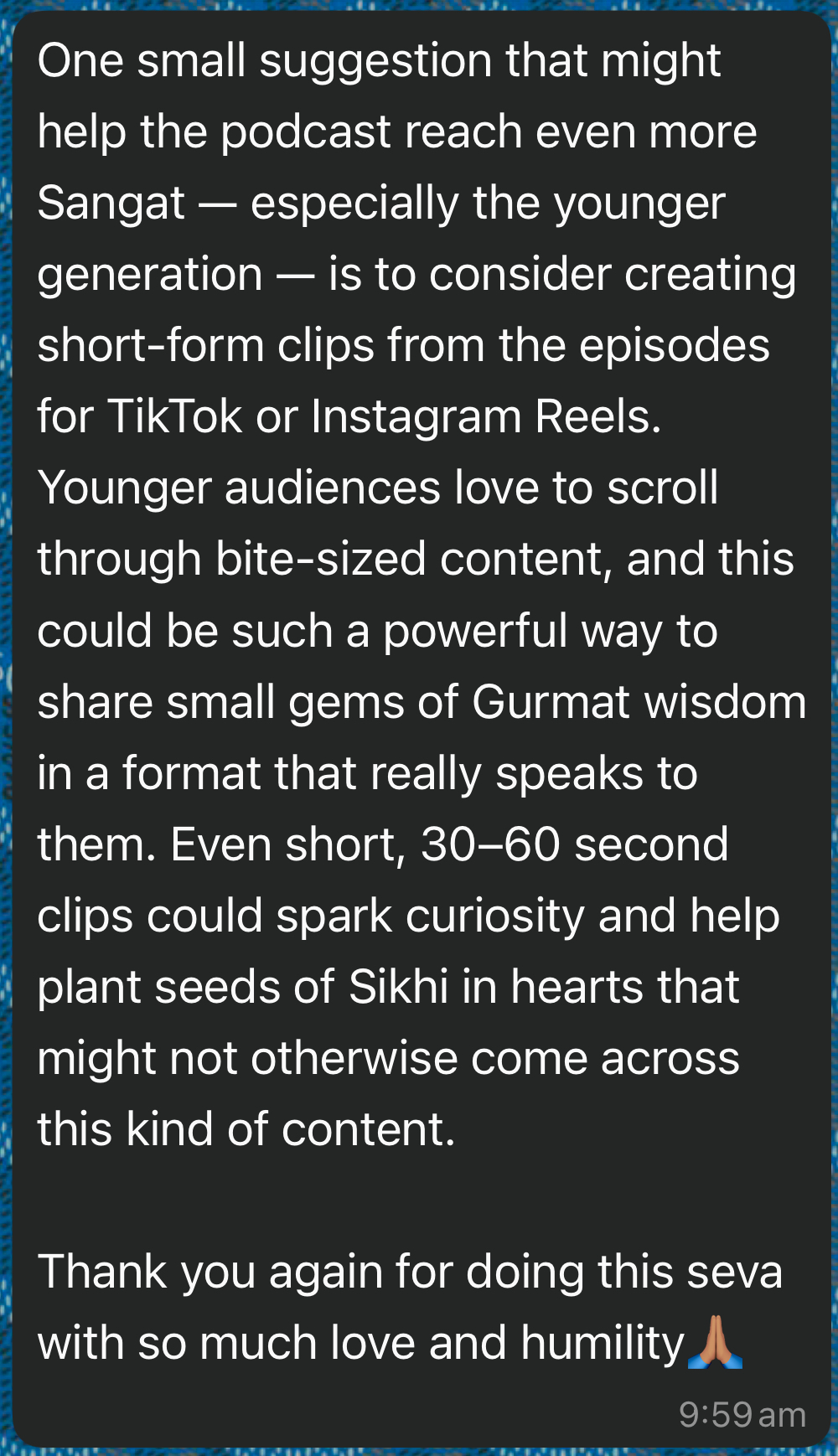 The suggestion recommends creating short-form clips from the episodes for platforms like Instagram Reels to reach more veiwers, especially younger audiences. The feedback points out that younger viewers prefer scrollable, bite-sized content, and this approach could effectively share “Gurmat” in a format that resonates with the 18-30 age demographic, which I accomplished.