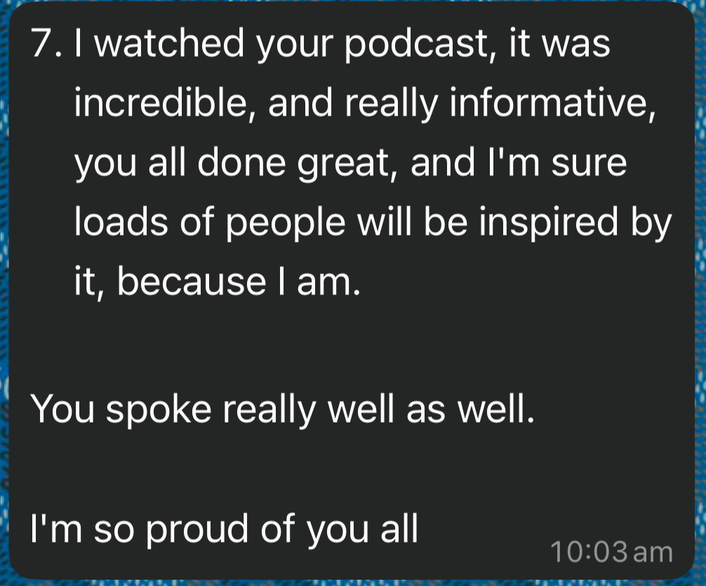 This project revealed the complexity of podcast production when handled by a single individual. I discovered that hosting, organising, editing, and marketing a podcast embodies such a broad range of specialised skills that any one of these aspects would normally require a full-time role. The nature of the type of production I was doing, requires mastery across technical, creative, and promotional domains, making it particularly challenging for a solo creator. Despite these challenges, I learned that dedication and strategic time management can overcome resource limitations. Through careful planning and consistent effort, I was able to produce a podcast that achieved showed quality standards and gained international recognition. This experience taught me the value of persistence, adaptability, and attention to detail, as well as the importance of leveraging existing networks and platforms to maximise reach. Most importantly, I gained insight into audience engagement across different platforms and how to tailor content to meet specific demographic preferences. The success of my marketing strategy demonstrated that understanding your audience’s behaviour and platform preferences is crucial for effective content distribution and engagement.