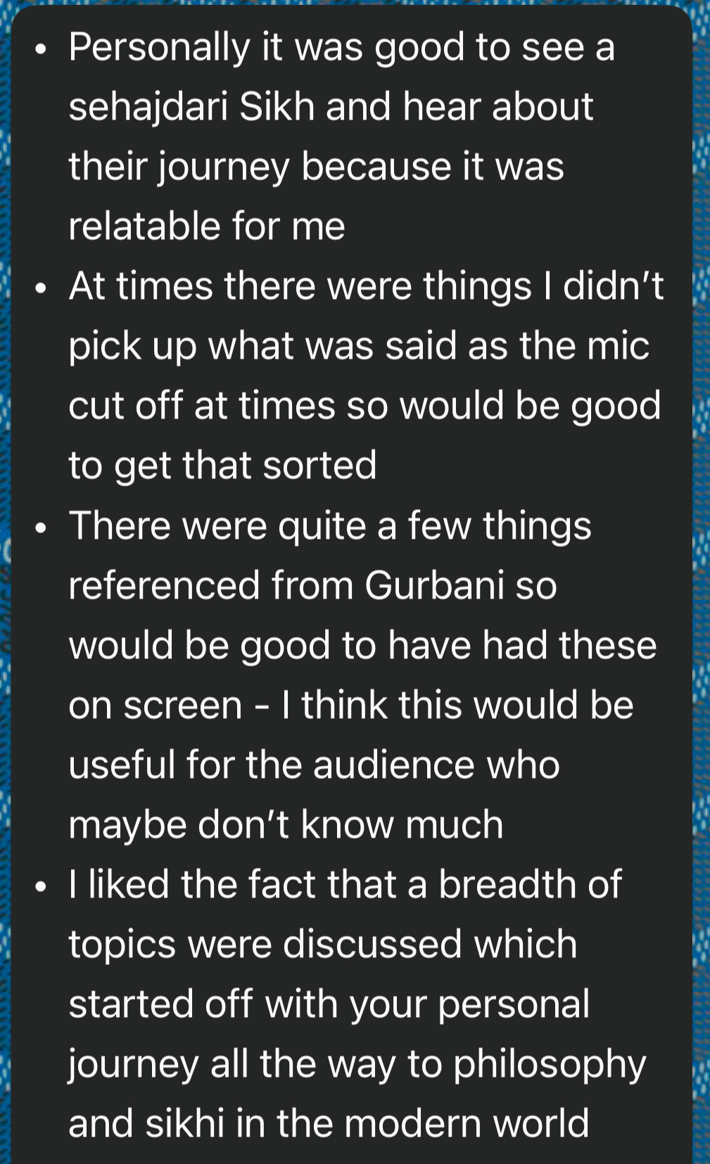I liked how it dived into topics that aren’t really discussed much and it felt engaging for speaking as someone who is also on the path of sikhi