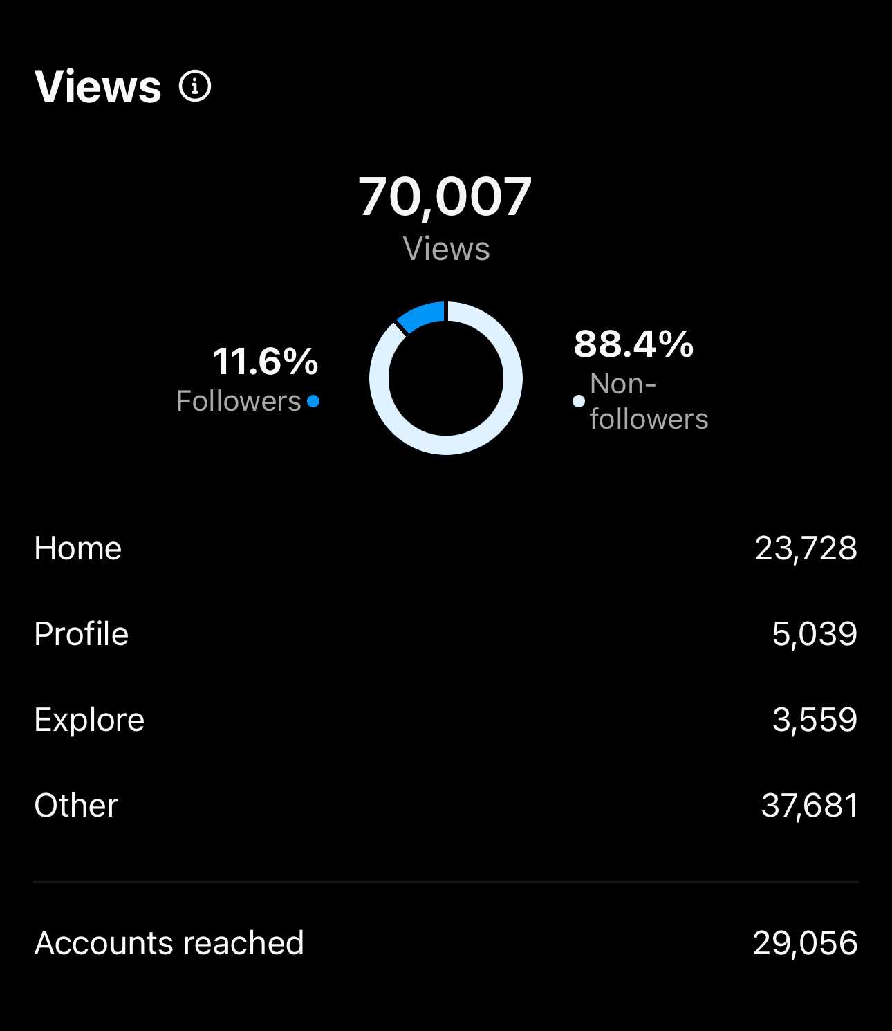 Upon analysing the post’s performance through Instagram insights, I found that the majority of views came from the Explore page. This suggests that the Instagram algorithm favoured the post, increasing its visibility to a wider audience beyond my current followers.