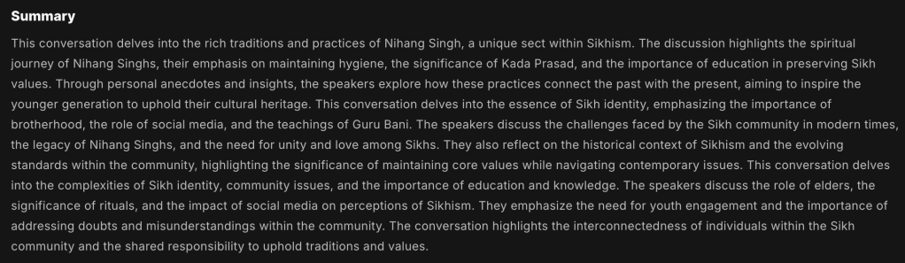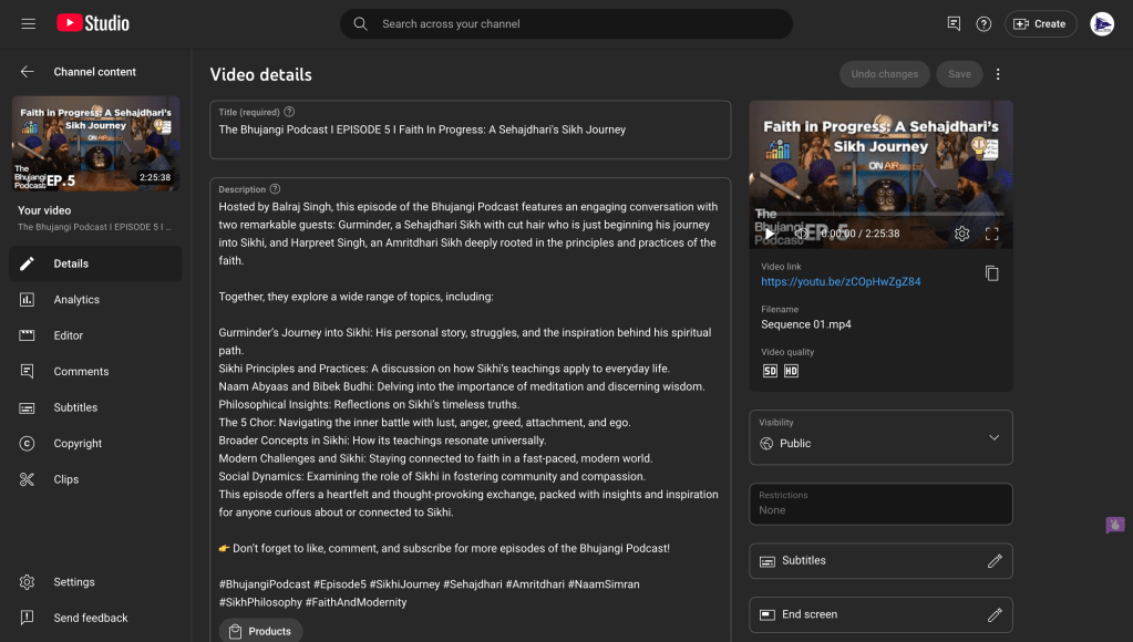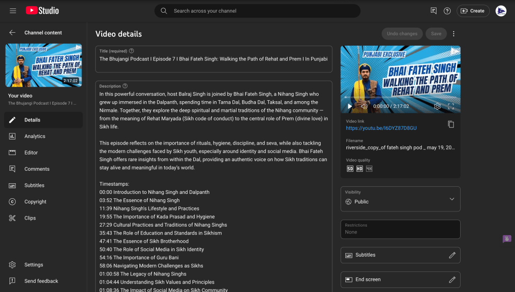 When publishing the podcast, I followed the same steps I had used for Episode 7 of Sikhfinity. Once again, I uploaded the video file to enhance the overall listener experience on Spotify, for those who prefer a more visual and immersive format. This approach also allowed me to maintain a consistent multimedia presence across both Spotify and YouTube, giving audiences on each platform the flexibility to engage with the podcast in the way that suited them best.
